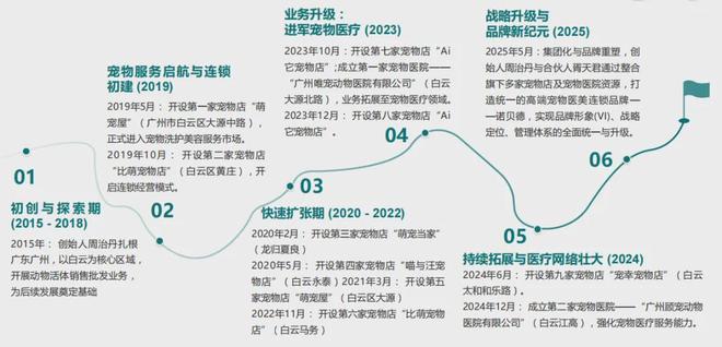 2015 - 2018 年为初创探索期,创始人扎根广州开展活体业务,奠定基础;2019 年开启宠物服务与连锁初建;2020 - 2022 年快速扩张,多家宠物店开业;2023 年业务升级进军宠物医疗;2024 年持续拓展医疗网络;2025 年战略升级与品牌重塑,整合资源打造统一高端宠物医美连锁品牌,实现品牌形象、战略定位、管理体系全面升级。